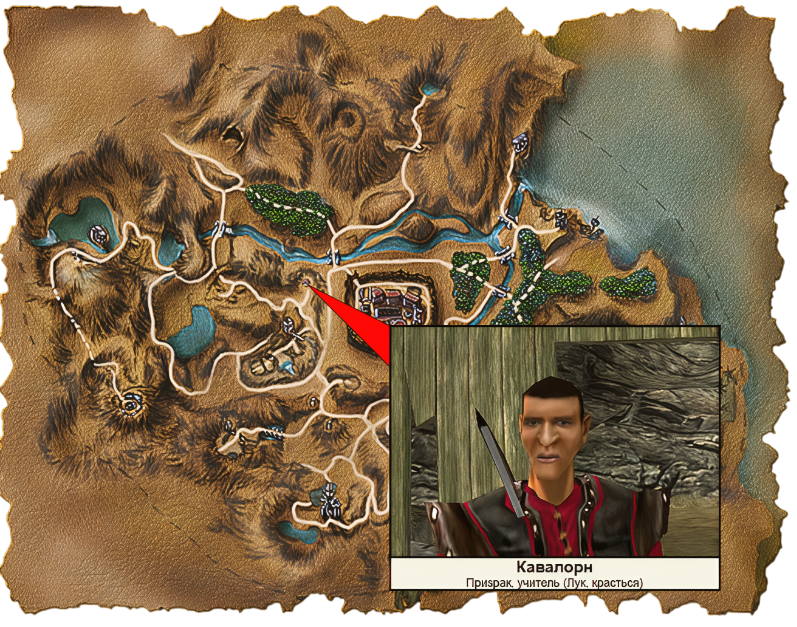 Кавалорн, которая находится за пределами Старого Лагеря и охотится возле своей хижины. У него можно обучиться красться и стрельбе из лука (до 2 уровня). Также у него можно купить несколько луков и арбалетов.